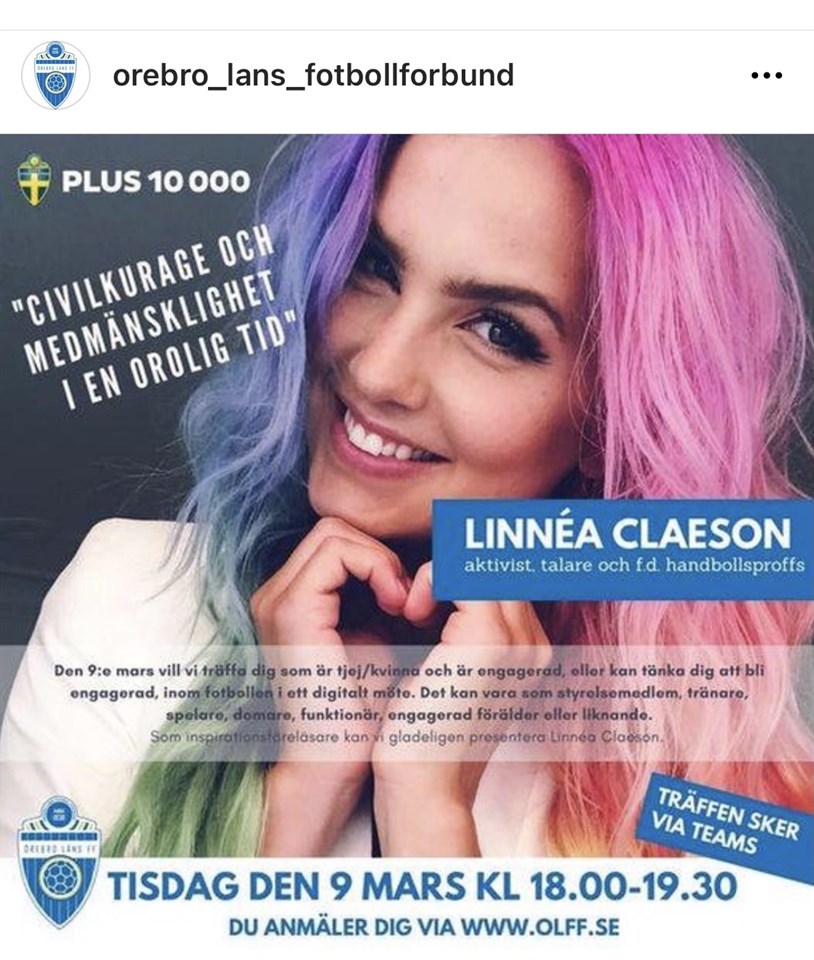9:e mars hålls en digital föreläsning om jämställdhet och tjejer/kvinnors förutsättningar inom idrotten, och i det här fallet fotbollen! Gå in och anmäl er. Det är er det gäller!! https://orebro.svenskfotboll.se/nyheter/2021/02/linnea-claeson/