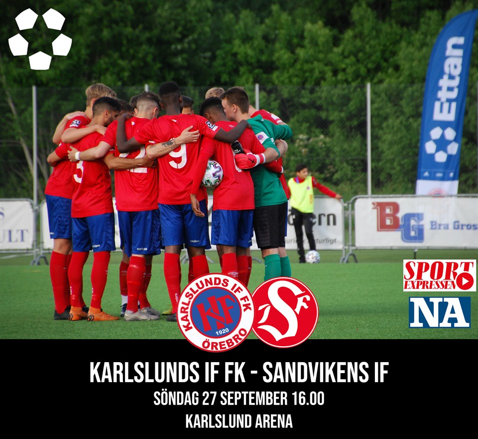 Efter tre raka bortamatcher för Karlslunds IF FK är det nu äntligen dags igen för hemmamatch då vi möter Sandvikens IF på Karlslund Arena under söndagen. De tre bortamatcherna för Karlslunds del blev en blandad kompott med seger mot IF Karlstad (1-2), oavgjort mot Nyköpings BIS (1-1) och förlust mot IK Frej Täby (3-2). Sandviken kommer senast från en tung 1-0-seger hemma mot BP efter ett sent mål i matchen. Innan dess hade laget faktiskt fem matcher utan vinst i Ettan Norra. Sandviken och Karlslund möttes i premiären av årets Ettan Norra, en match som slutade 1-1. Efter den matchen har respektive lag fightats om ytterligare 54 poäng var, där Sandviken har samlat ihop totalt 29 poäng och befinner sig på en 6:e plats, medan Karlslund på en 14:e plats har 19 poäng. Vi har inför matchen öppnat upp för publik och för förköpsbiljetter (max 50 åskådare). Det finns fortfarande möjlighet att köpa biljett till matchen. För mer info, klicka här. Matchen går även att se på SportExpressen Play och på NA. Lycka till boys!