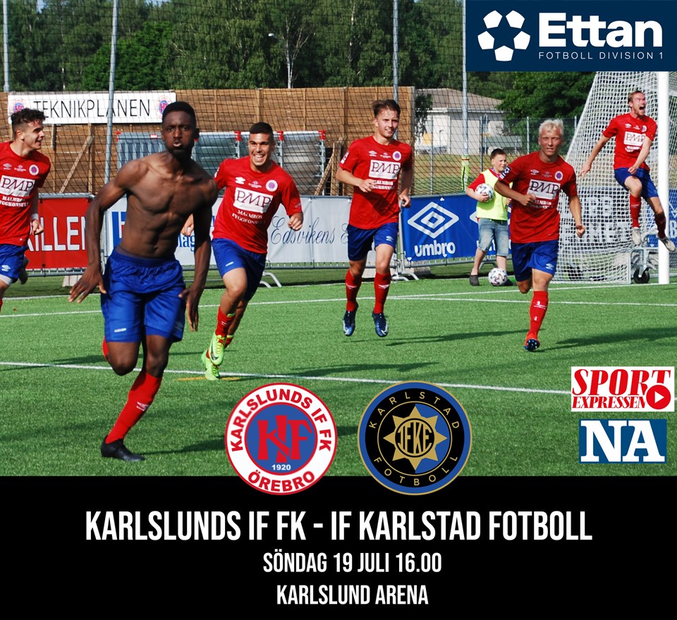 Vi är nu framme vid den sista omgången innan ett kortare uppehåll av årets Ettan-säsong. Vi har hunnit avverka åtta matcher på en månad och nu är det alltså dags för den sista kraftansträngningen innan ett litet break. Vi välkomnar IF Karlstad Fotboll till Karlslund Arena! IF Karlstad Fotboll är en ny sammanslagning av klubbar i Värmland, denna gång är det Karlstad BK och Carlstad United som slog ihop sina verksamheter efter förra säsongen för att bli ännu slagkraftigare. Det brukar i regel finnas minst ett lag från Karlstad som är uppe och slåss i toppen av tabellen av Ettan, de senaste åren har det varit Carlstad United. Årets start av säsongen kan därmed ha blivit en liten missräkning för värmlänningarna även om laget vann senast hemma mot Örebro Syrianska IF med 3-2. I och med segern ligger Karlstad på en elfteplats i tabellen på nio poäng efter åtta omgångar, en poäng före Karlslunds IF FK. Karlslund kommer också senast från en seger då laget vann borta mot Täby FK med 2-0. En match lite olik de föregående då det tidigare har varit Karlslund som oftast skapat flest chanser och haft större delen av bollinnehavet men ändå inte fått med sig poäng i vissa av matcherna. Mot Täby var det täbyiterna som denna gång fick bita i det sura äpplet då Karlslund har lite flyt och kan göra två sena mål. Karlslund och Karlstad möttes på försäsongen i slutet av februari, innan Coronasituationen blev till allvar även i Sverige. Matchen vann Karlslund med 4-1 efter en fin prestation. Nu är det ny match där det spelas om poäng och hemmalägret vill givetvis avsluta denna speciella ”vårsäsong” snyggt med att ta med sig en ny seger! Matchen spelas som vanligt numera utan publik men går att se digitalt på SportExpressen Play och på NA. Kör hårt boys!