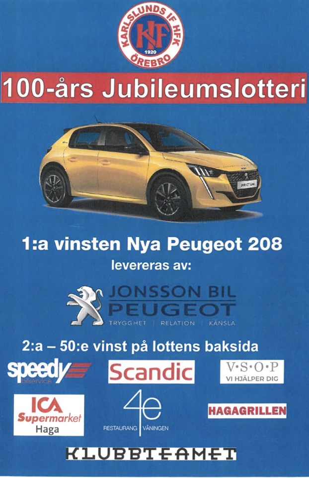 Karlslunds IF fyller 100 år i år och det vill vi fira på många sätt! Bl a har vi i år ett jubileumslotteri med finfina priser! Blir det kanske precis DU som vinner bilen, ny Peugeot 208?! 🚙⚽ Swisha 300 kr/lott till 123 478 25 95 och skriv din adress i meddelande så kommer lotten/lotterna på posten Dragningen blir i oktober och dragningslistan annonseras på hemsidan. laget.se/kifhfk För mer info: ingerwahman@hotmail.com, 070-8330871