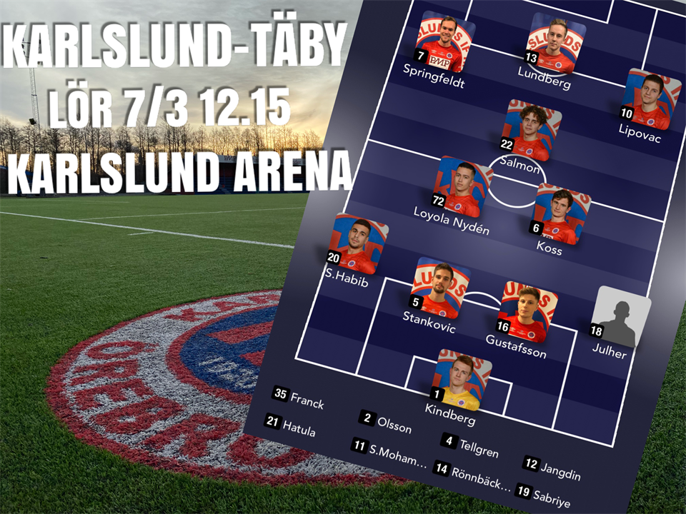 Med endast fyra veckor kvar till seriepremiären i Ettan Norra börjar nu muttrarna och skruvarna dras åt lite extra så här under försäsongen. Idag kl 12:15 är det dags för ny träningsmatch och vi gästas av Täby FK, som är nykomlingar i Ettan. Täby FK vann Division 2 Norra Svealand förra säsongen med imponerande 23 vinster på 26 matcher och endast en förlust. Klubben bildades så sent som 2012 då Täby IS och IFK Täby slogs ihop, och det är nu första gången i klubbens korta historia som man spelar så högt i seriesystemet som i Ettan. Täby kommer senast från en 0-3 förlust i en träningsmatch mot Akropolis IF, vilka vann Ettan Norra förra året och numera tillhör Superettan. Karlslund har inför denna match fått tillbaka ett par spelare från skadelistan, om än ett par spelare kvar på samma lista. I lördags spelade laget 2-2 mot BK Forward i en träningsmatch, och i tisdags vann man med hela 8-0 mot Vretstorps IF i kvalet till Svenska cupen. Karlslund ställer upp med följande manskap (som bilden visar)! Vi hälsar er varmt välkomna till Karlslund Arena och till matchen mellan Karlslund-Täby!